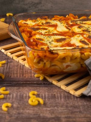 Nudelauflauf mit Tomatensauce und Mozzarella