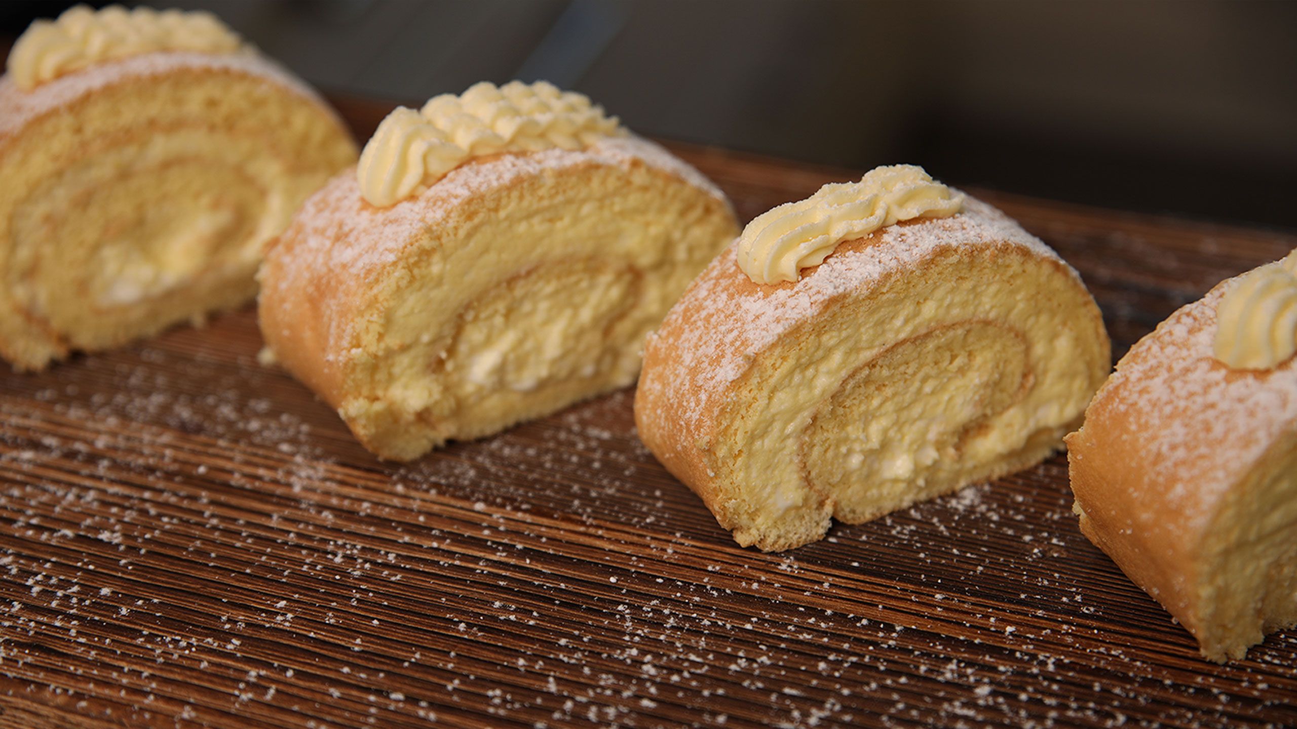 Danach due Creme gut verrühren und auf dem Bisquit verteilen. Das Bisquit nun zu einer Stange einrollen.